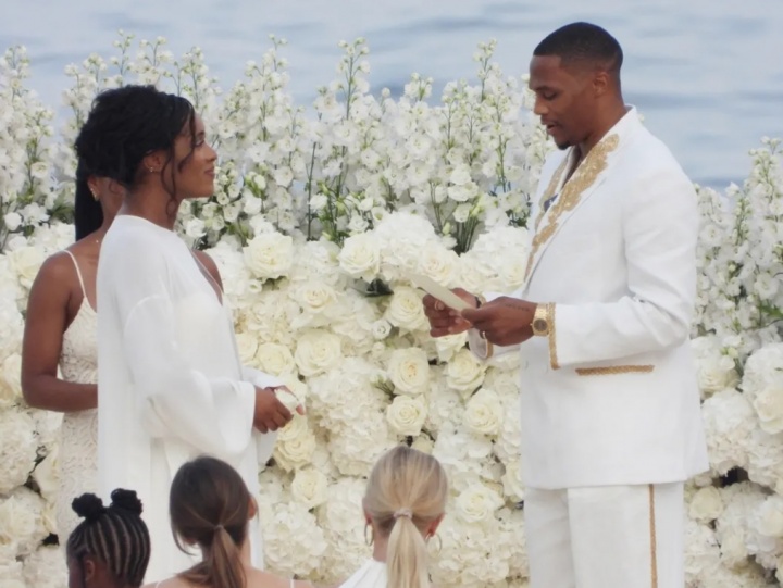 现场画面中,威少感动落泪,妻子妮娜身穿一袭精美白色长裙,指间闪耀钻戒光芒。